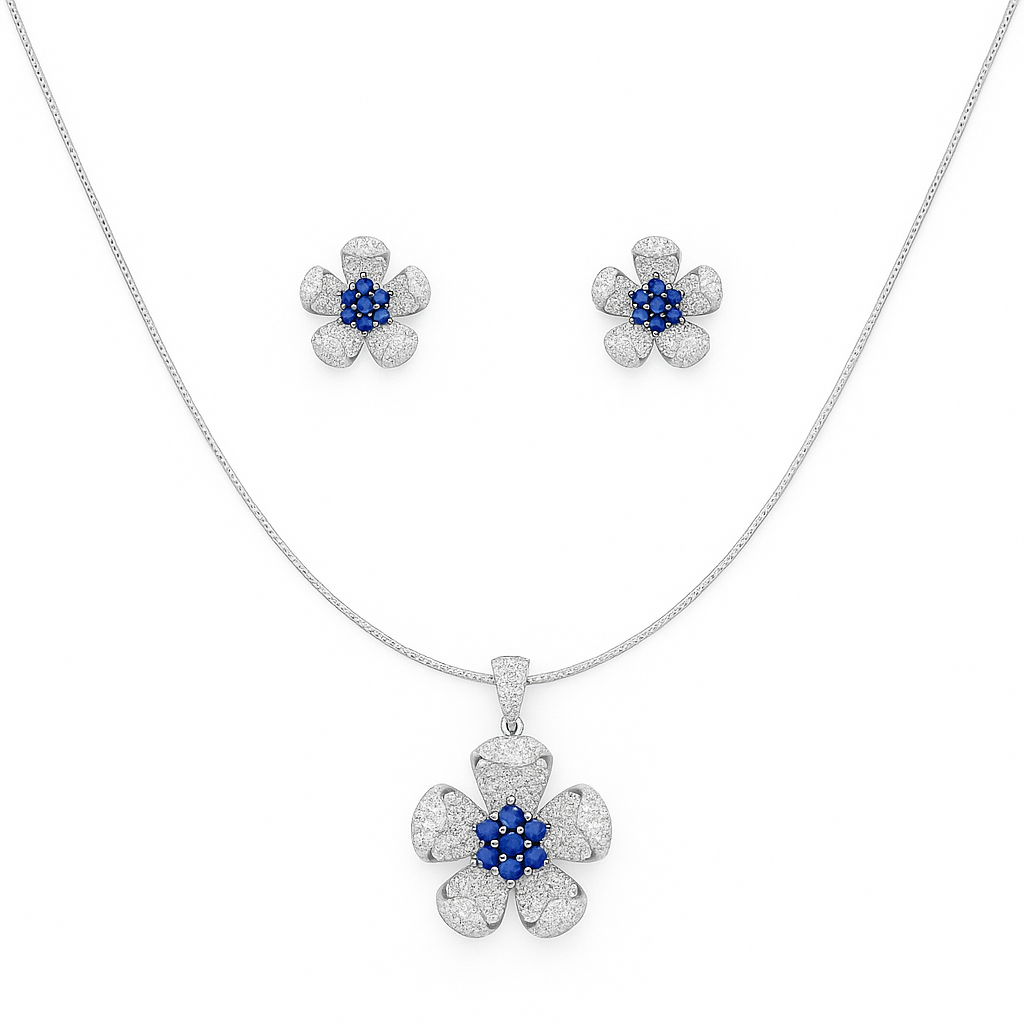 The Sapphire Bloom Silver Set captures the charm of nature in a timeless jewelry design. Handcrafted from 925 sterling silver, this necklace and earring set features a delicate five-petal floral motif adorned with shimmering cubic zirconia. At the heart of each flower lies a cluster of deep blue sapphire-colored stones, creating a striking contrast that exudes sophistication.