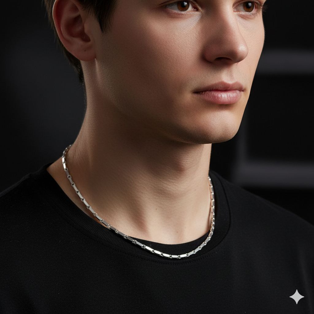 Introducing a piece of modern elegance: the Bar Link Chain. Unlike traditional round or oval links, this chain is composed of sleek, uniform, rectangular links that lie flat, creating a smooth and structured profile. It's a contemporary take on classic chains, offering a sharp, sophisticated look.